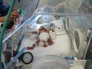 Matthew was moved into an isolette this afternoon. He has been on a table until this point because he needed to be watched so closely and because the doctors and nurses might have to jump in at a moment's notice to deal with a problem. Now that he's stabilized, the isolette provides him a quieter environment in which to grow. The isolette provides a temperature controlled environment for him until he's got a layer of baby fat and can regulate his body temperature himself. Once he's about 1900g, they'll move him to a bassinet until he's ready to go home.